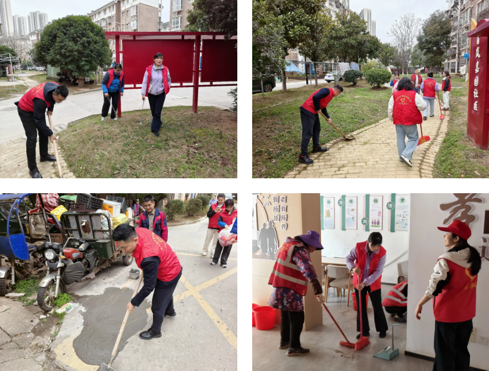 在红色物业小广场区域,大家手持锄头、铲子,认真清理路边杂草,并用工具仔细捡拾绿化带内的落叶与杂物,确保环境整洁无死角。在社区邻里中心,大家仔细擦拭门窗桌椅,清洁地面,整理室内设施,为社区居民营造良好生活环境。