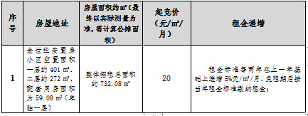 备注:1、租金不含物业管理费,需另外按每月2.8元/㎡/月收取,装修免租期为3个月,免租期内需正常缴纳物业管理费。2、中标人需同时签订物业服务合同及支付首季度物业费用,否则作废标处理。3、房屋以现状出租,涉及一切维修改造工程产生的费用均由承租人自行承担。4、金世纪安置房小区空置面积673㎡(一层约401㎡、二层约272㎡)与江西金开正合实业有限公司签订房屋租赁合同,配套用房面积59.08㎡与南昌金开枫林物业管理有限公司签订房屋租赁合同,整体招租面积732.08㎡由南昌金开枫林物业管理有限公司一并签订物业服务合同;