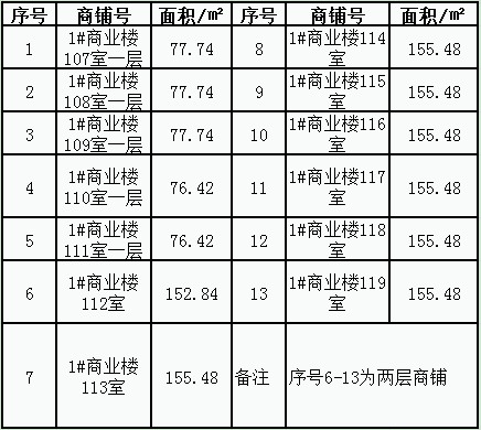 序号 商铺号 面积/㎡ 序号 商铺号 面积/㎡ 序号 商铺号 面积/㎡