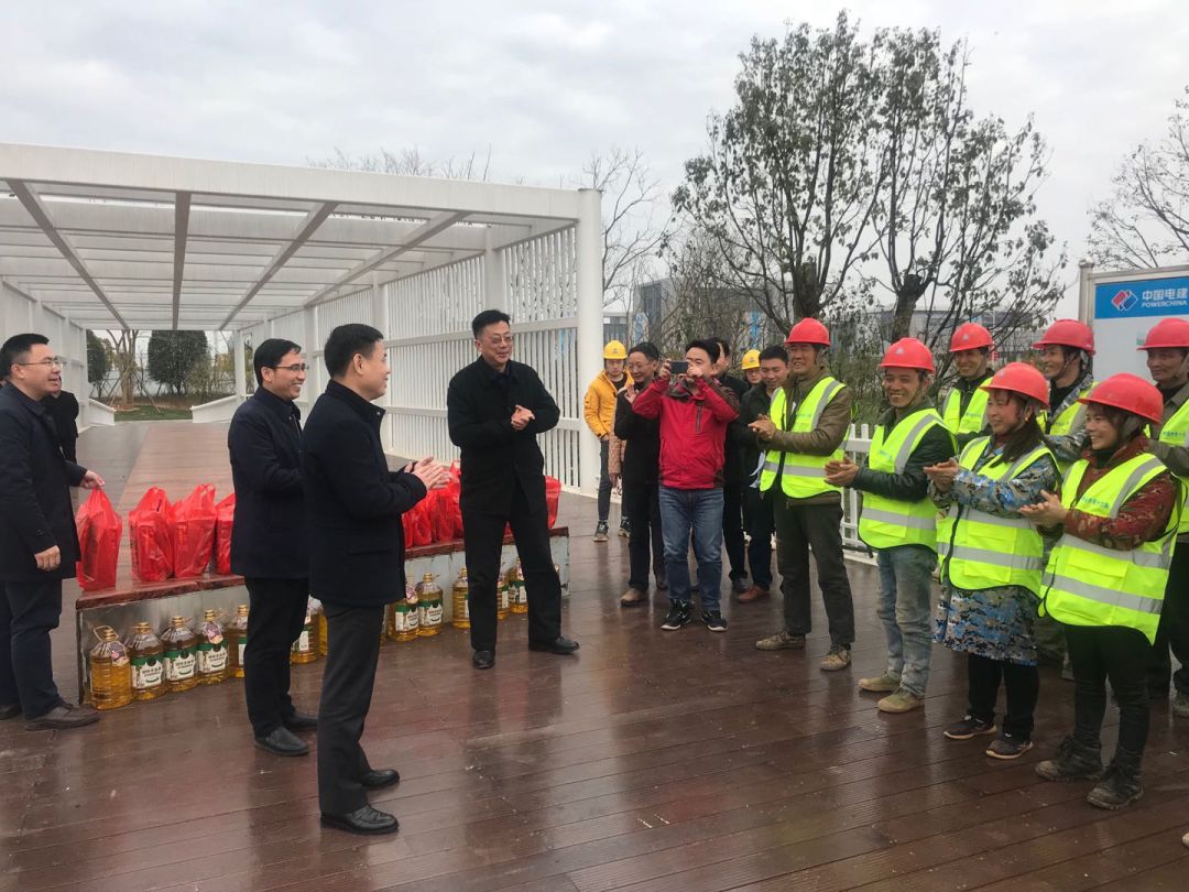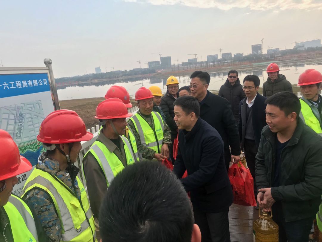 区党工委副书记程建兵来到儒乐湖公园北岸慰问一线工人,向他们的辛勤劳动给予鼓励并致以节日的问候,并对下一步的工作进行了布置。金开球友会手机版总经理潘贤林,副总经理袁扣华、边文彬,施工单位等相关人员陪同。