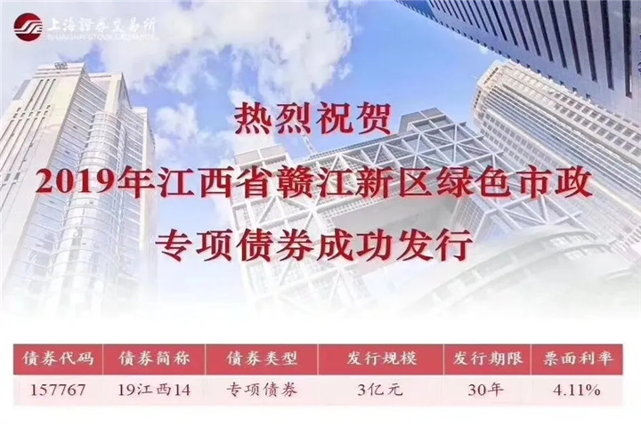 6月18日,江西省赣江新区绿色市政专项债券(一期)经省政府批准同意在上海证券交易所成功发行。本期债券发行金额3亿元,信用评级AAA,期限30年,发行利率4.11%,继去年4月江西省首单绿色私募可转债落地经开区后,全国首单绿色市政专项债券成功落地南昌经开区(赣江新区经开组团)。
