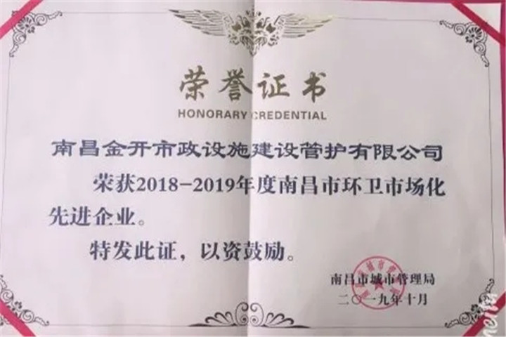 在2018至2019年度“南昌市环卫市场化先进企业”评选中,金开球友会手机版下属管护公司以排名第一的成绩从28个外包企业中脱颖而出,获得“南昌市环卫市场化先进企业”称号。