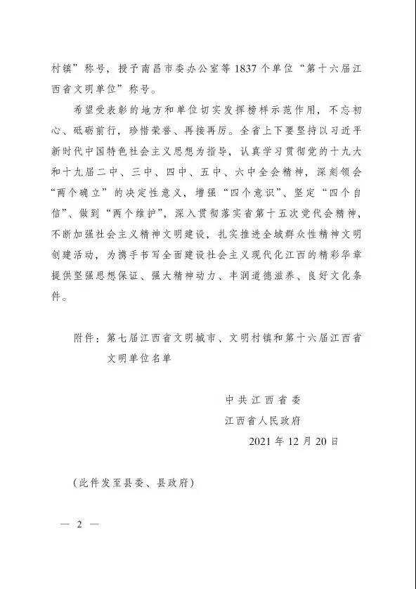 为充分发挥榜样示范作用,大力培育和践行社会主义核心价值观,全面推进公民道德建设,进一步调动全社会参与文明城市、文明村镇、文明单位创建工作的积极性、主动性和创造性,12月20日,中共江西省委、江西省人民政府对“第七届江西省文明城市”“第七届江西省文明村镇”“第十六届江西省文明单位”进行了通报表扬。