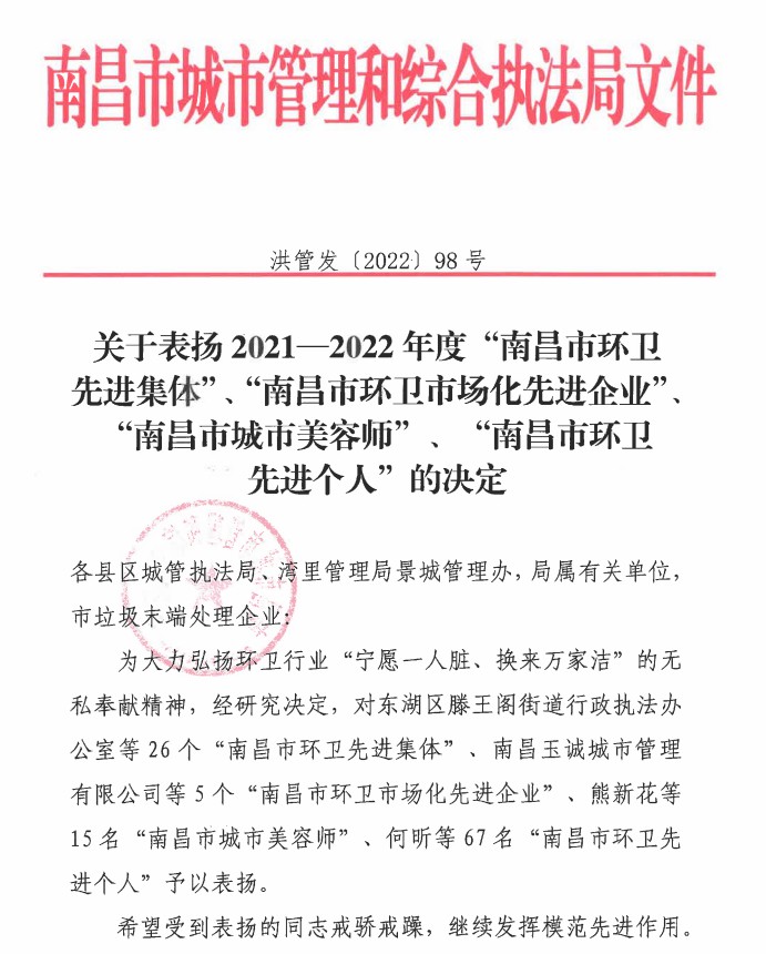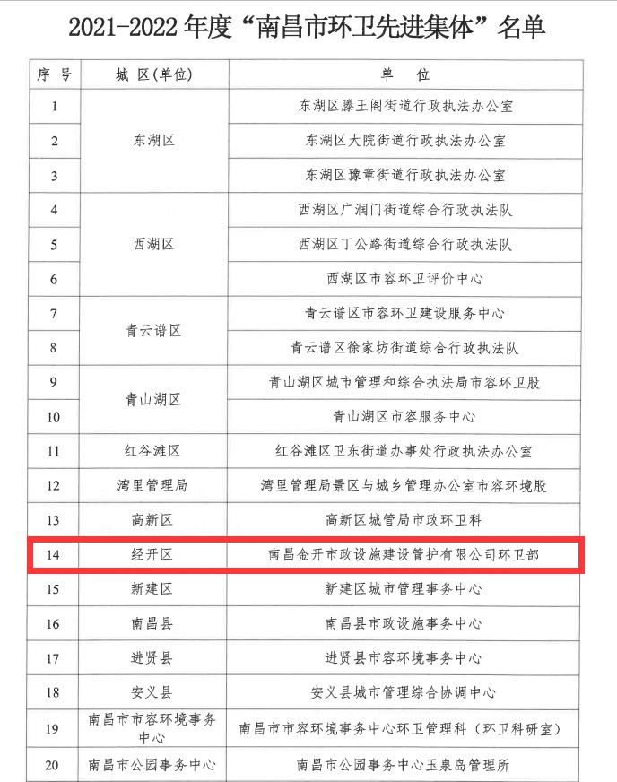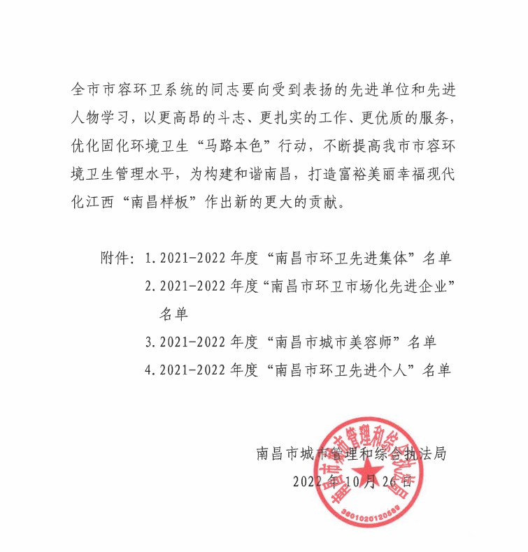 为大力弘扬环卫行业“宁愿一人脏、换来万家洁”的无私奉献精神,经南昌市城管局研究决定,授予南昌金开市政设施建设管护有限公司环卫部2021-2022年度“南昌市环卫先进集体”荣誉称号。