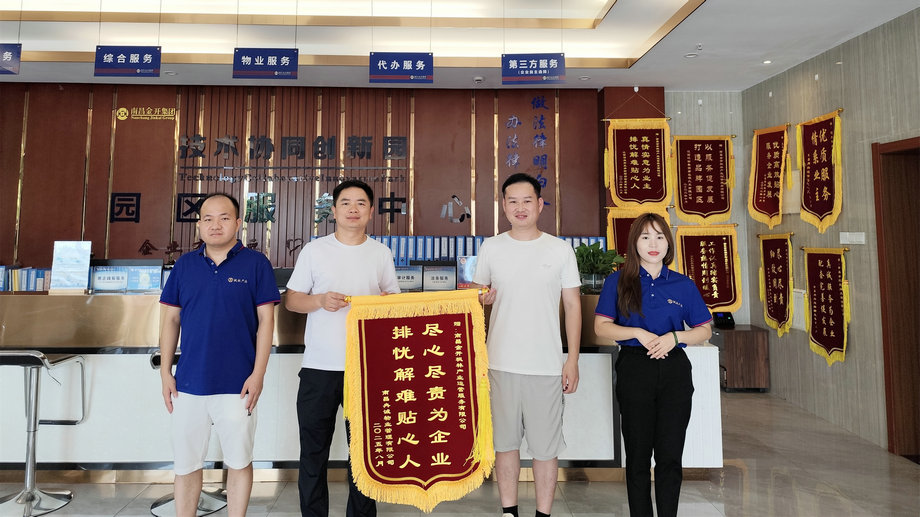 区企业——南昌冉诚物业管理有限公司专程送"尽心尽责为企业 排忧解难贴心人"的锦旗,感谢枫林物业公司在政策申报、资源对接及关联公司注册等环节提供的精准服务。南昌冉诚物业管理有限公司表示枫林物业公司"店小二"式的贴心服务切实解决了企业发展中的实际困难,既为企业营造了良好的营商环境,也为企业在本地扎根发展提供了有力支持。