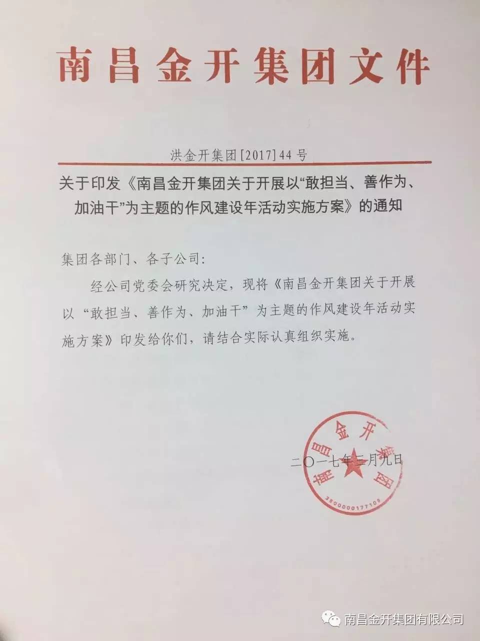 根据实施方案文件精神,球友会手机版监察审计部制定了《南昌金开球友会手机版“敢担当、善作为、加油干”作风建设年活动实施方案》。2017年拟在球友会手机版范围内由球友会手机版监察审计部牵头开展“作风建设年”活动,主要解决“不作为、不善为、不快为”的三项问题,活动分为动员部署阶段、推进实施阶段、考核总结阶段,要求球友会手机版各部门、各子公司高度重视,扎实推进各项工作。